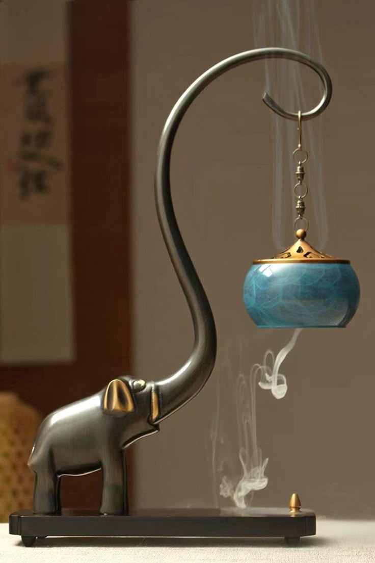 Crafted from high-grade copper, this elephant-shaped hanging incense burner is both a functional piece and a striking decor accent. Designed for backflow incense, it creates a calming cascade of smoke that flows gently through the sculpture, adding a sense of peace and movement to your space. The intricate elephant design symbolizes wisdom and strength, making it a meaningful addition to meditation areas, living rooms, or entryways. Ideal for incense lovers, collectors, or anyone who appreciates artisanal details and spiritual calm.