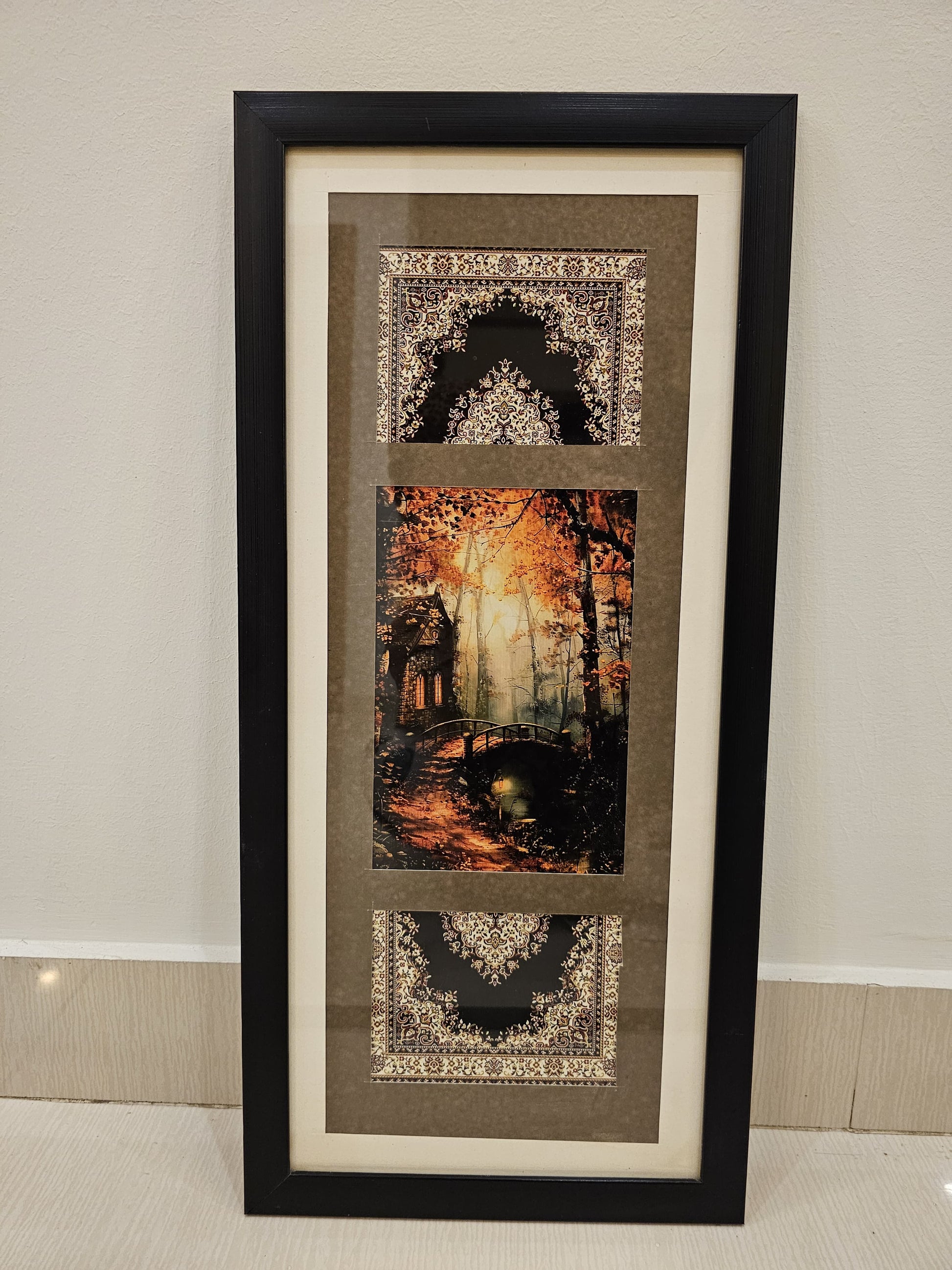 Golden Passage is a striking triptych that blends serene landscape imagery with rich traditional patterns. The central panel captures a peaceful scene—a sunlit building nestled among trees, connected by a graceful bridge over water, evoking stillness and reflection. Framing this view are two intricately designed panels inspired by oriental rugs or prayer mats, featuring floral and arch motifs in elegant tones of black, white, and gold. Together, the three parts create a balanced composition that brings cultural depth and visual harmony to any space. Ideal as a wall hanging or framed centerpiece, this artwork speaks to both heritage and tranquility.